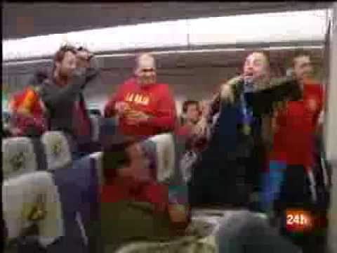España Celebra el Titulo en el Avión ( Reina,Villa y Ramos Borrachos)